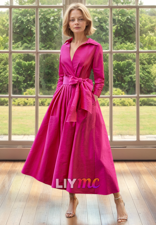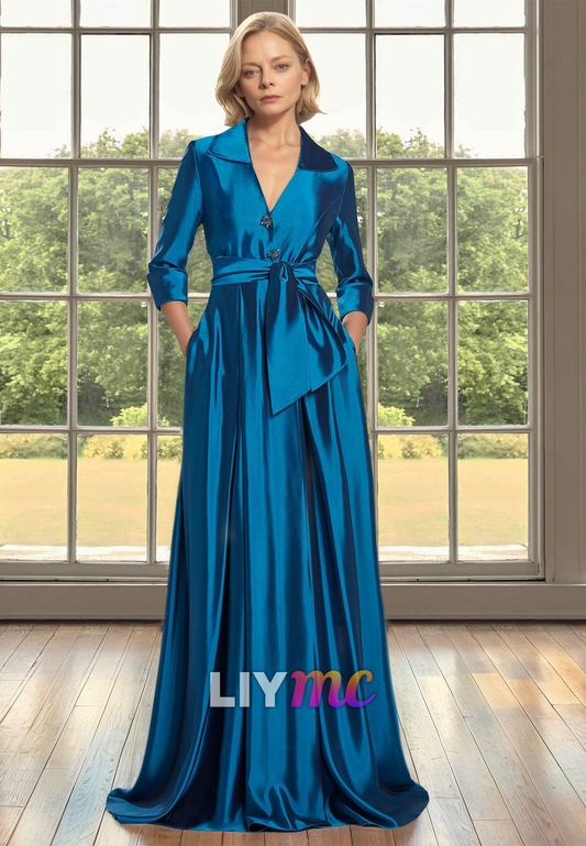 V-Neck Long Sleeves Pleated Blet Side Slit A-Line Mother of Bride Dress