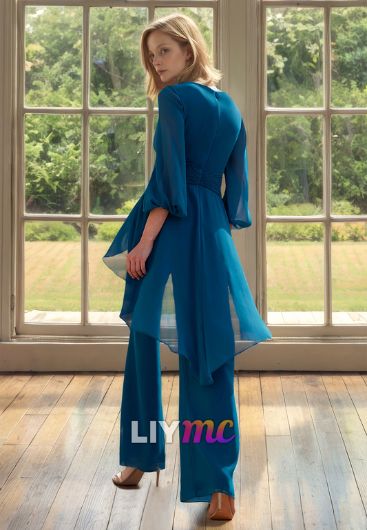 V-Neck Long Sleeves Chiffon Jumpsuit Mother of Bride Dress