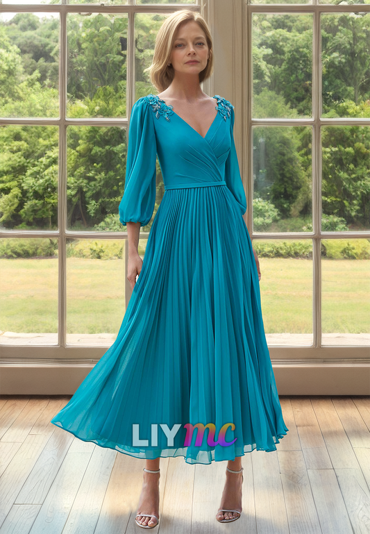 V-Neck Long Sleeves Pleated Chiffon Appliques A-Line Mother of Bride Dress