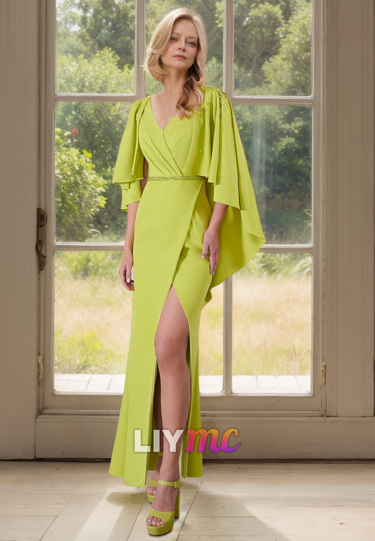 V-Neck Long Sleeves Side Slit Beaded Pleated Sheath Mother of Bride Dress