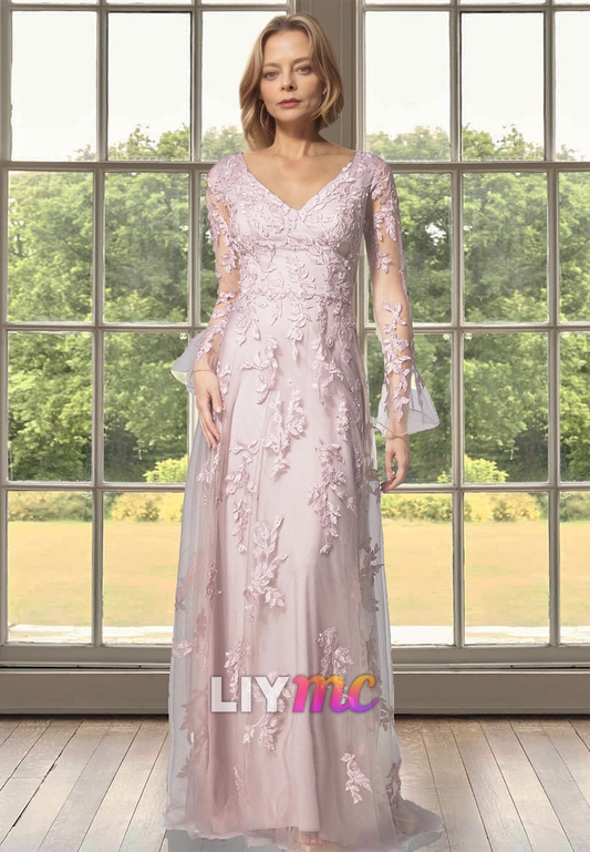 V-Neck Long Sleevess Appliques A-Line Mother of Bride Dress