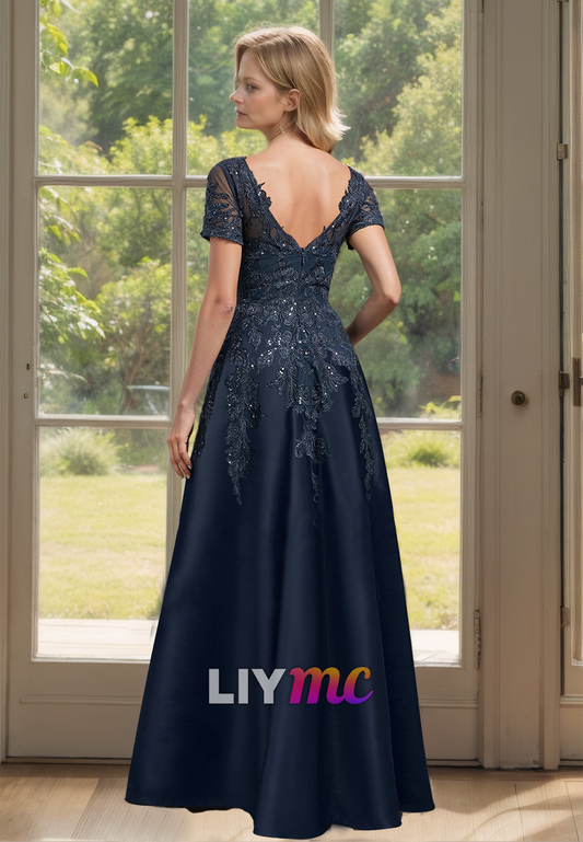 V-Neck Short Sleeves Appliques Pleated Satin A-Line Mother of Bride Dress