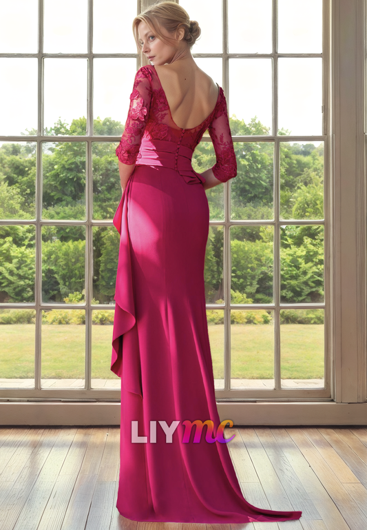 Scoop Long Sleeves Appliques Ruched Long Mother of Bride Dress Cocktail Dress