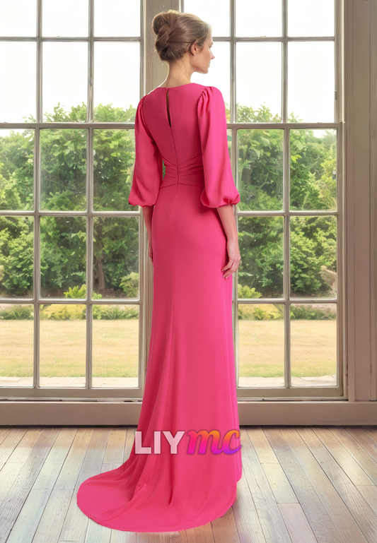 V-Neck Long Sleeves High Slit Long Mermaid Mother of Bride Dress Cocktail Dress