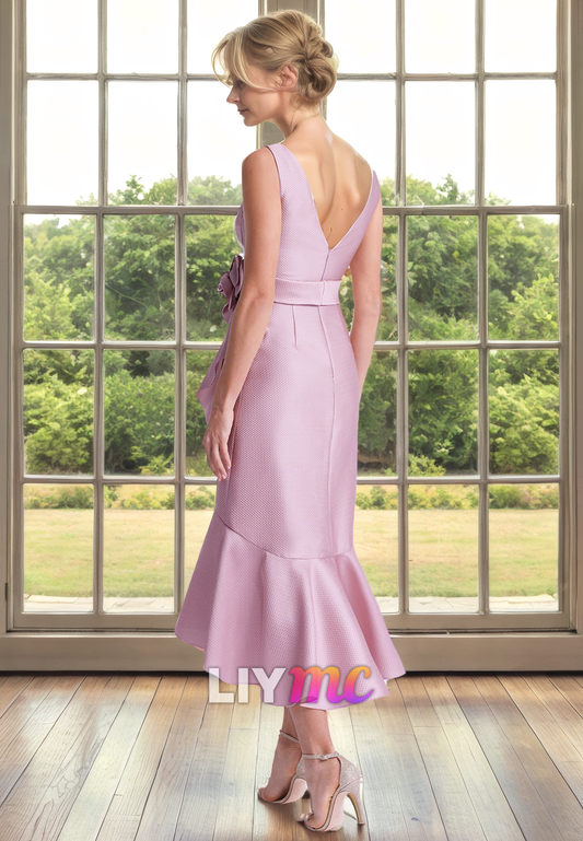 V-Neck Sleeveless Floral Ruffled A-Line Satin Mother of Bride Dress Cocktail Dress