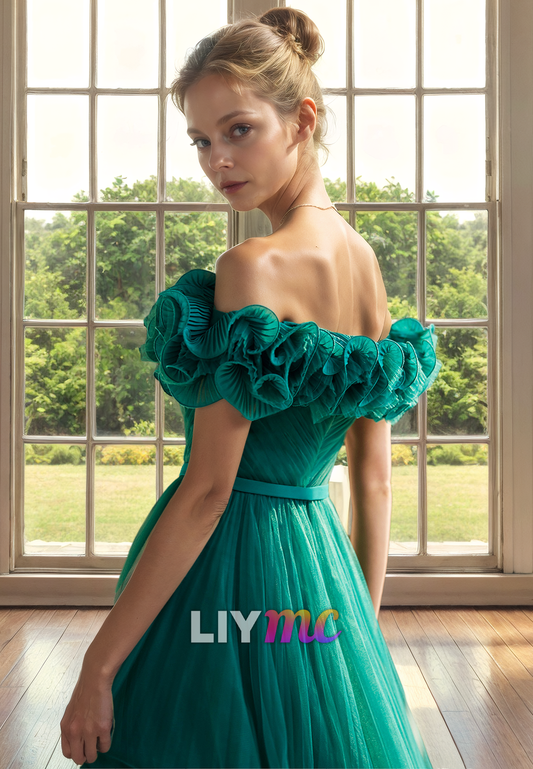 Off-Shoulder Cap Sleeves Ruffled Sheath Long Mother of Bride Dress Cocktail Dress