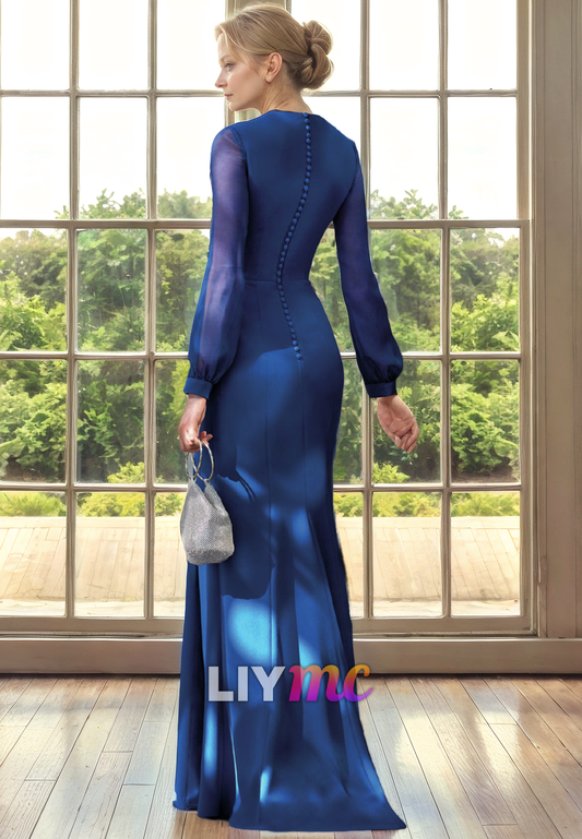 V-Neck Long Sleeves Sleek Mermaid Side Slit Mother of Bride Dress Cocktail Dress