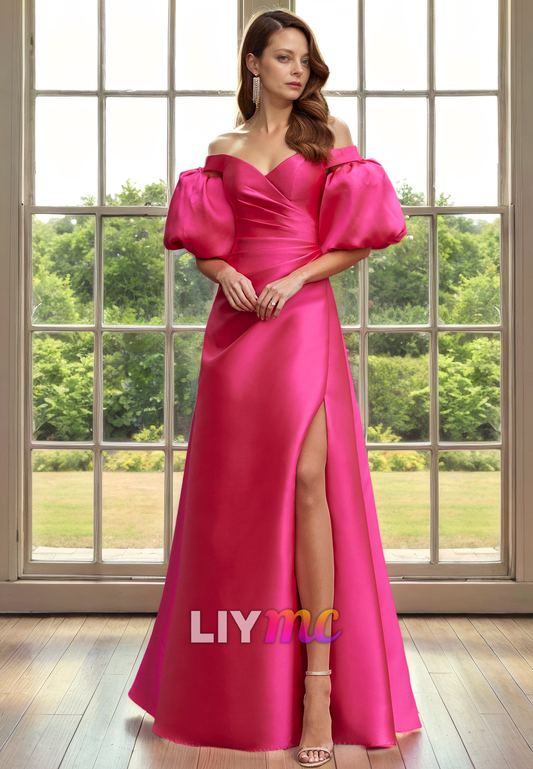 Sweetheart Puff Sleeves High Slit Sleek Satin A-Line Mother of Bride Dress