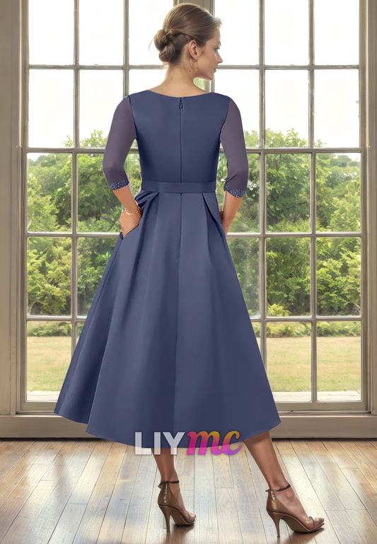 Asymmetrical Puff Sleeves Sleek Satin Sheath Mother of Bride Dress Cocktail Dress