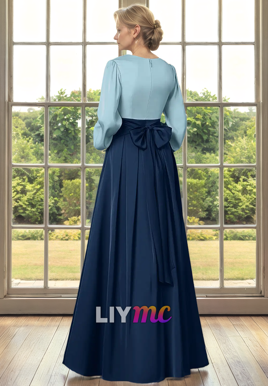 V-Neck Long Sleeves Chiffon Pleated A-Line Mother of Bride Dress