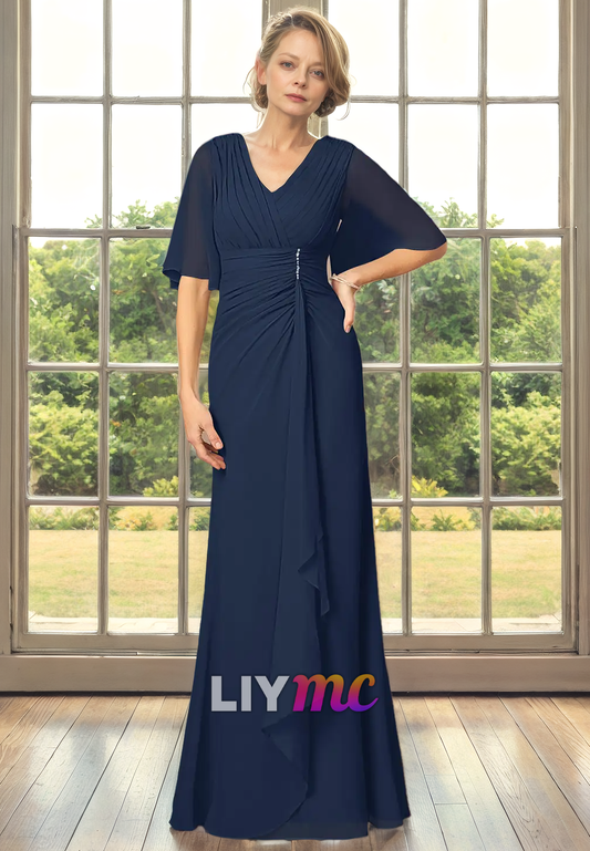 V-Neck Short Sleeves Chiffon Sheath Long Mother of Bride Dress
