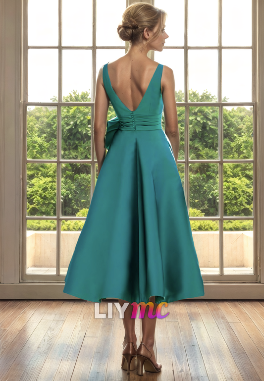 V-Neck Sleeveless Sleek Satin Pleated A-Line Mother of Bride Dress Cocktail Dress