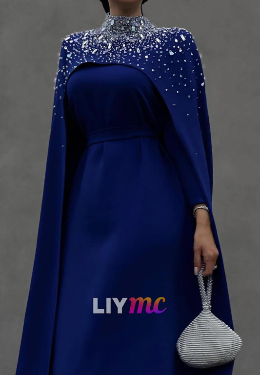 High Neck Long Sleeves Beaded Sheeath Royal Blue Evening Dress