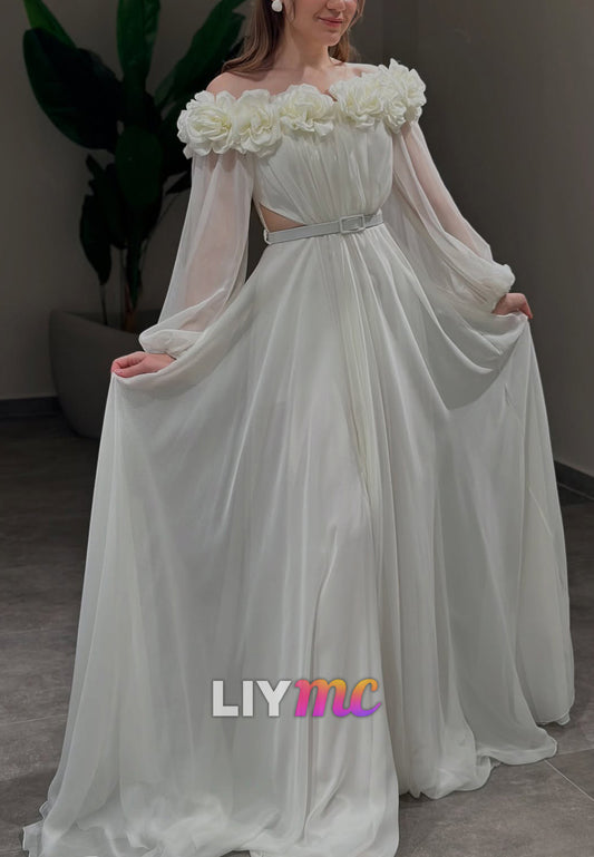 Off-Shoulder Long Sleeves 3D Floral A-Line Evening Dress