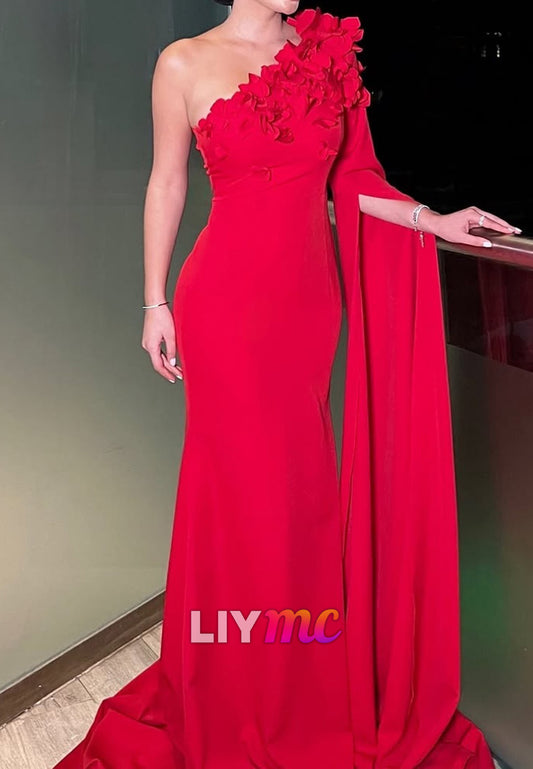 One Shoulder Long Sleeves Floral Embellished Mermaid Evening Dress