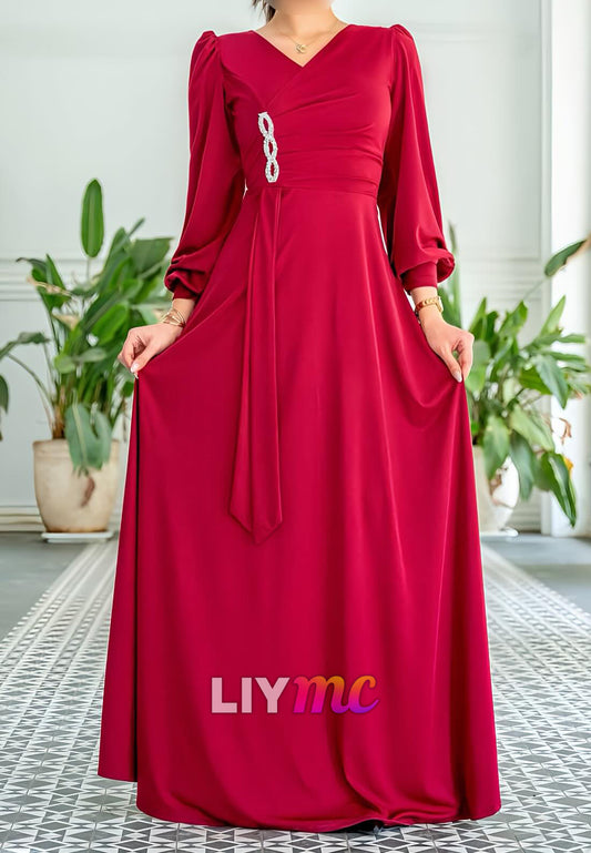V-Neck Long Sleeves Sleek A-Line Mother of Bride Dress