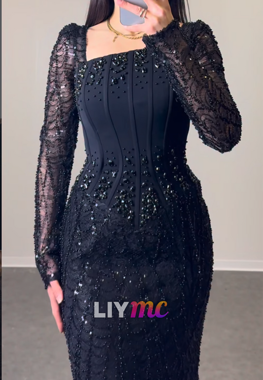 Asymmetrical Long Sleeves Beaded Mermaid Evening Dress
