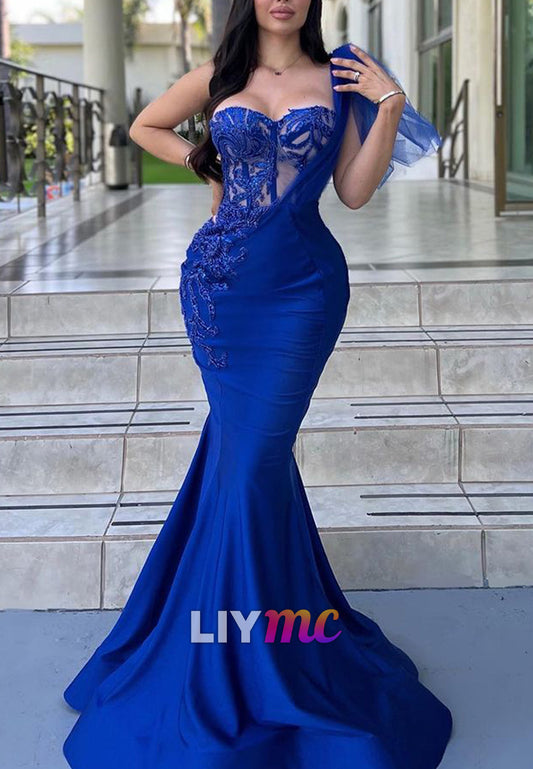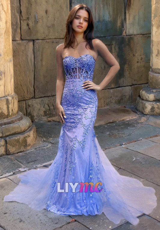 LP1223 - Elegant Blue Sweetheart Mermaid Lace Appliques Prom Evening Dress