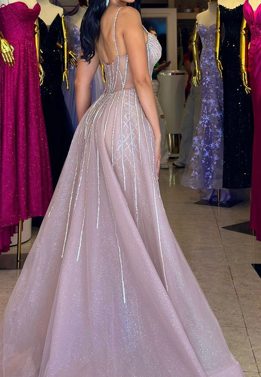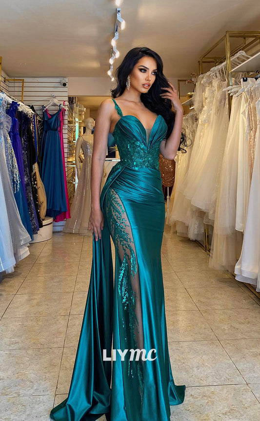 V-Neck Straps Beaded Pleated Sleek Evening Dress Mermaid Prom Dress