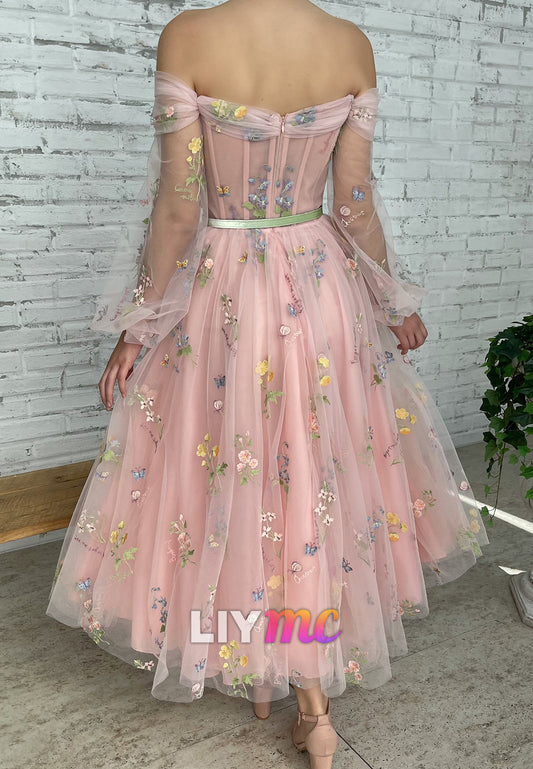 Off-Shoulder Long Sleeves Floral Appliques Formal Dress A-Line Party Dress