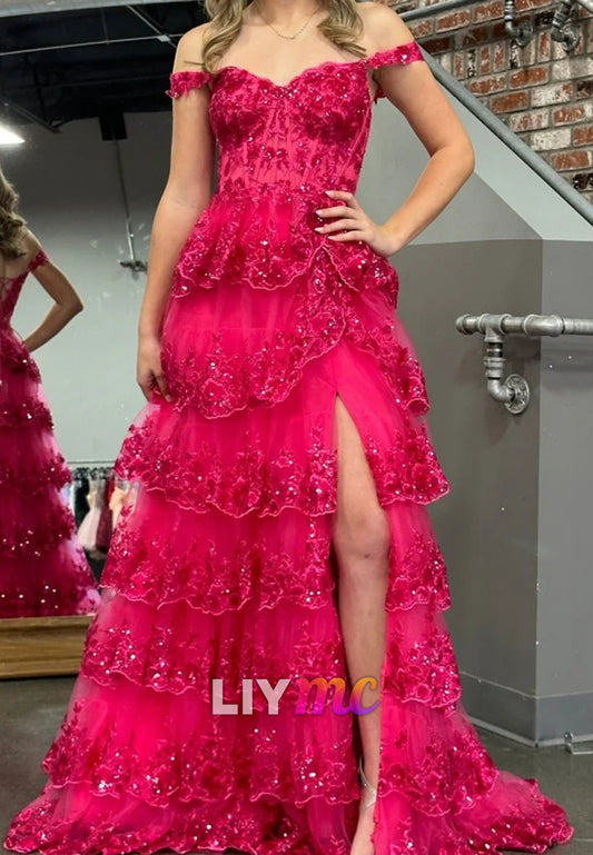 Off-Shoulder Sleeveless Pleated Beaded Tiered Mermaid Prom Dress