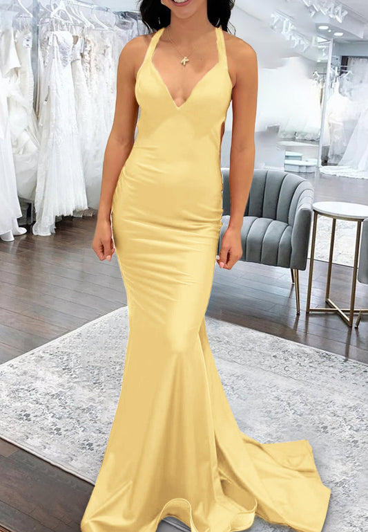 V-Neck Halter Sleek Sleeveless Formal Dress Mermaid Prom Dress