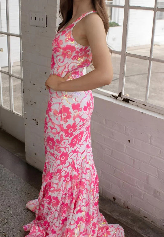 LP2045 - Classic Scoop Sleeveless Sleek Satin Floral A-Line Prom Dress