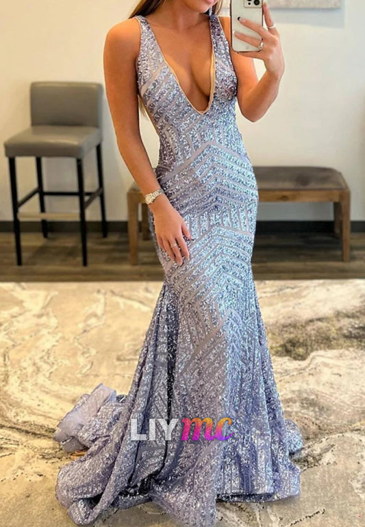 V-Neck Sleeveless Sequins Sparkly Mermaid Prom Dress
