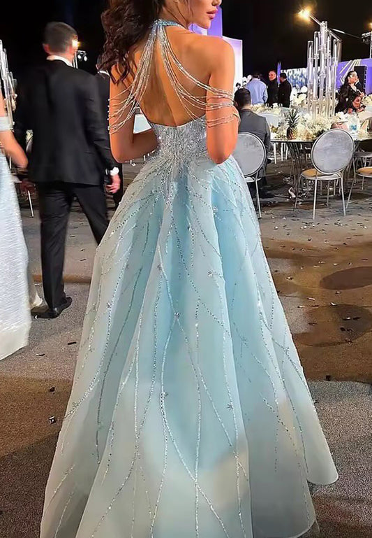 Halter Sleeveless Beaded Embroidery Sparkly Mermaid Evening Dress