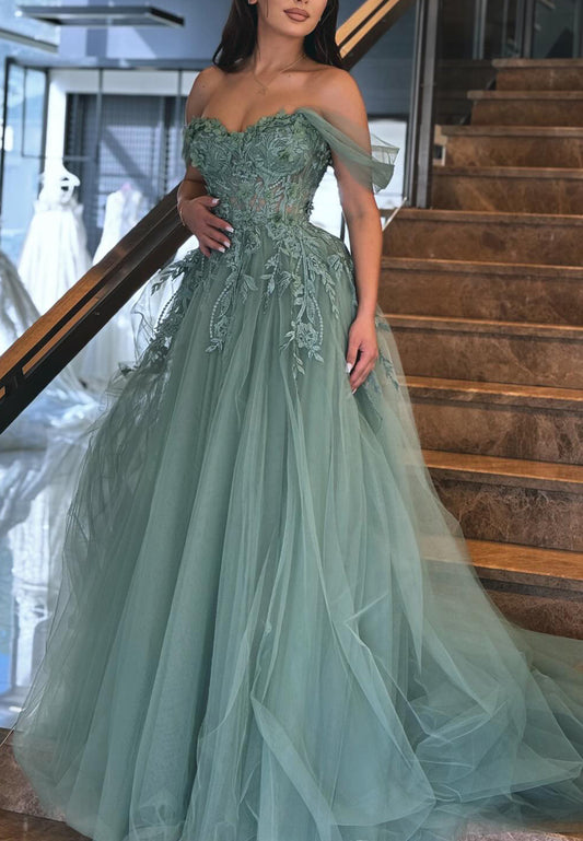 Off-Shoulder Sleeveless Tulle Appliques A-Line Prom Dress