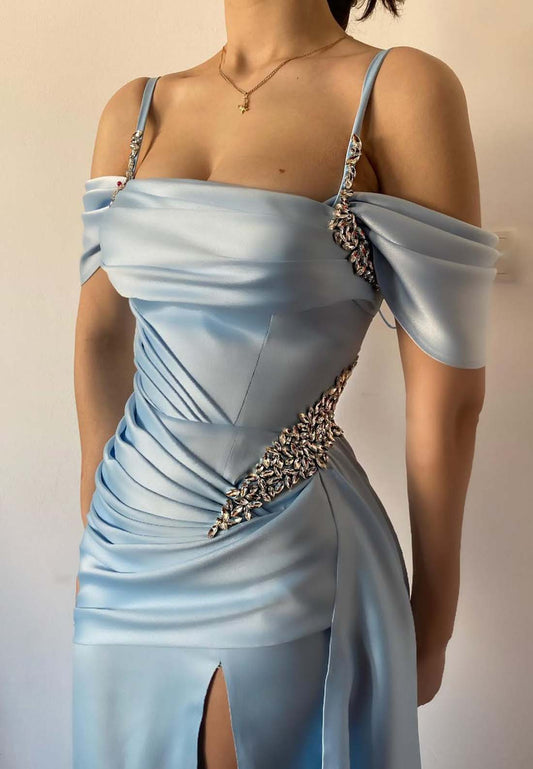 Off-Shoulder Spaghetti Straps Pleated Prom Dress Sheath Formal Dress