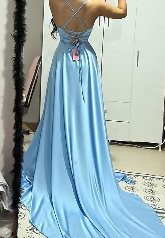 Scoop Spaghetti Straps Sleek Side Slit A-Line Prom Dress