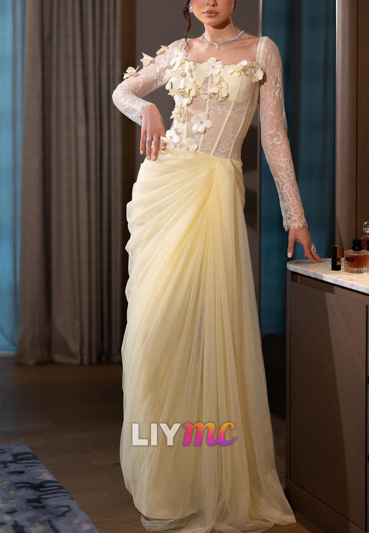 Square Long Sleeves 3D Floral Pleated Sheath Prom Dress