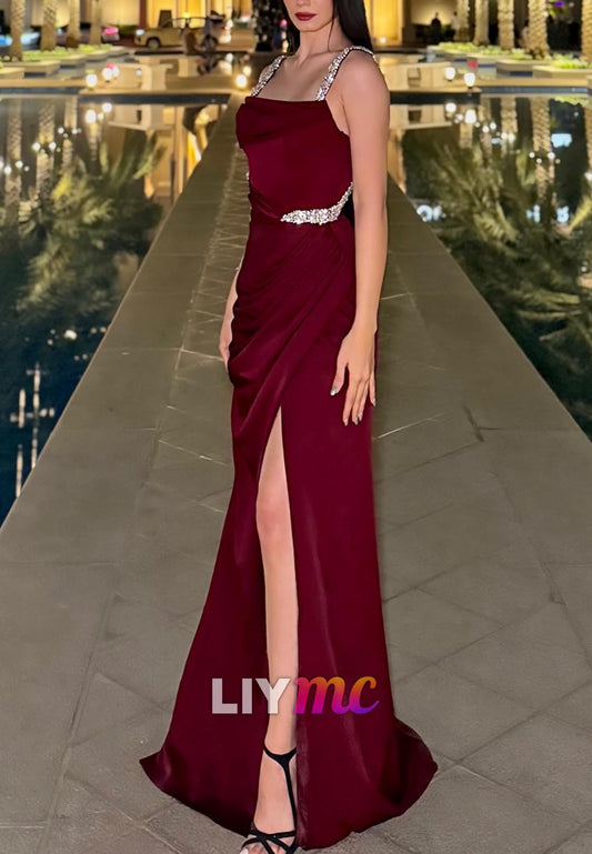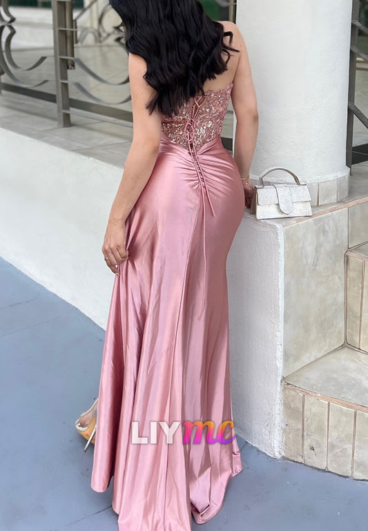 LP180 - Chic Sweetheart Beaded Ruched Satin Sheath Long Prom Evening Dress