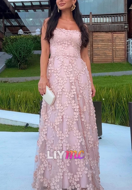 LP290 - A-Line Square Neck 3D Lace Tulle Long Prom Evening Dress With Slit