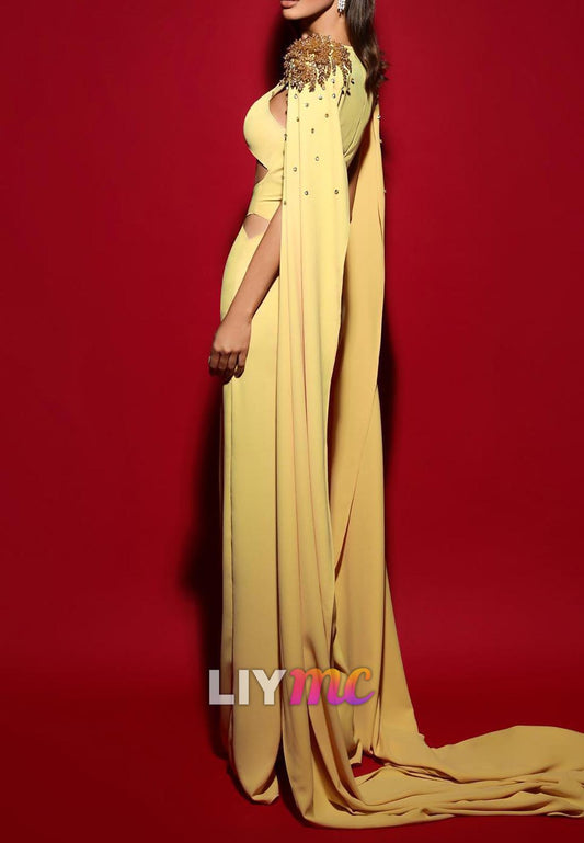 Asymmetrical Long Sleeves Pleated Beaded Sheath Evening Dress