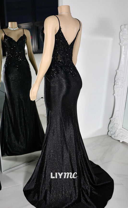 LP1412 - V-Neck Sleeveless Beaded Appliques Sleek Satin Sheath Mermaid Prom Dress