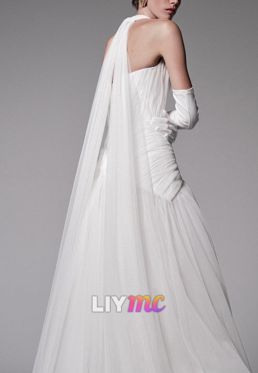 Halter Sleeveless Pleated Tulle A-Line Wedding Dress