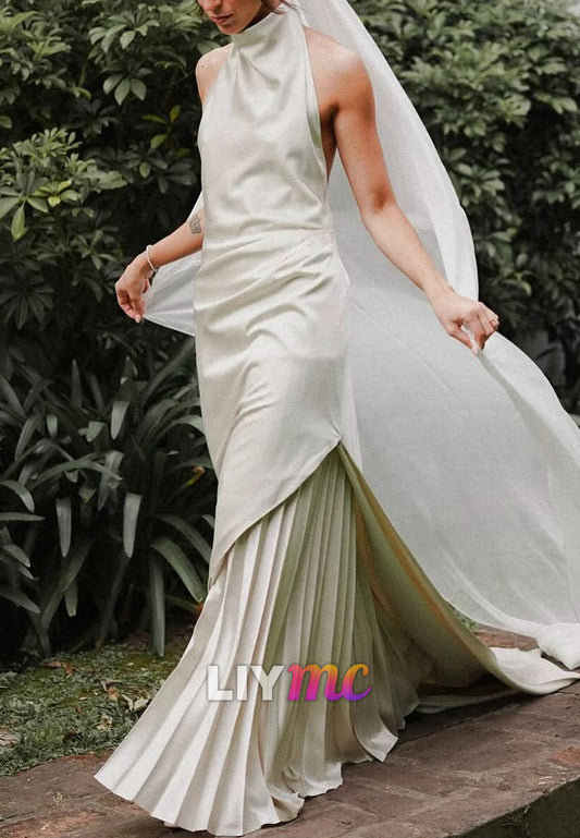 Halter Sleeveless Sleek Pleated Sheath Wedding Dress