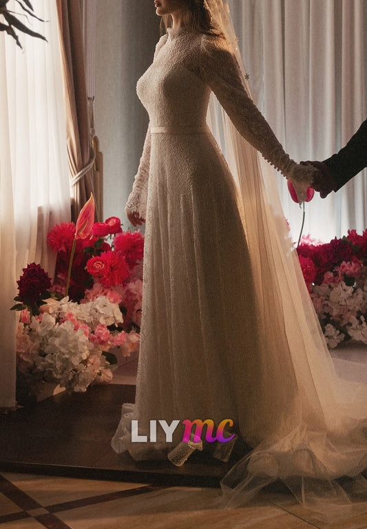 High Neck Long Sleeves Beaded Embroidery Appliques A-Line Wedding Dress