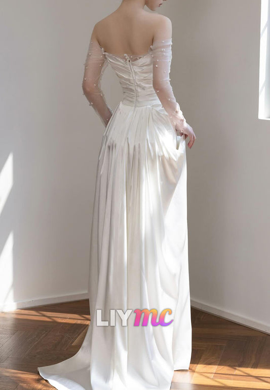 Off-Shoulder Long Sleeves Pleated Sleek Sheath Wedding Dress
