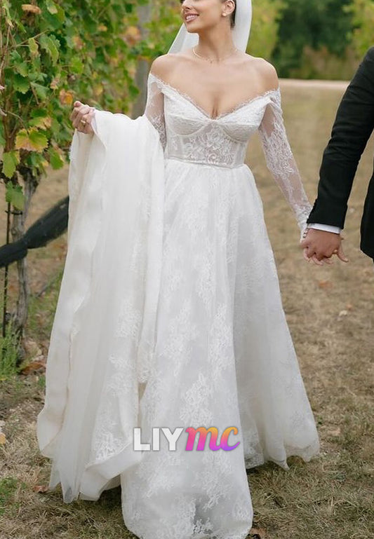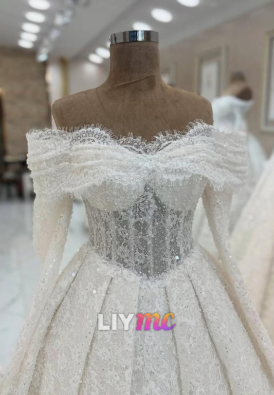 Off-Shoulder Long Sleeves Sequins Appliques A-Line Wedding Dress