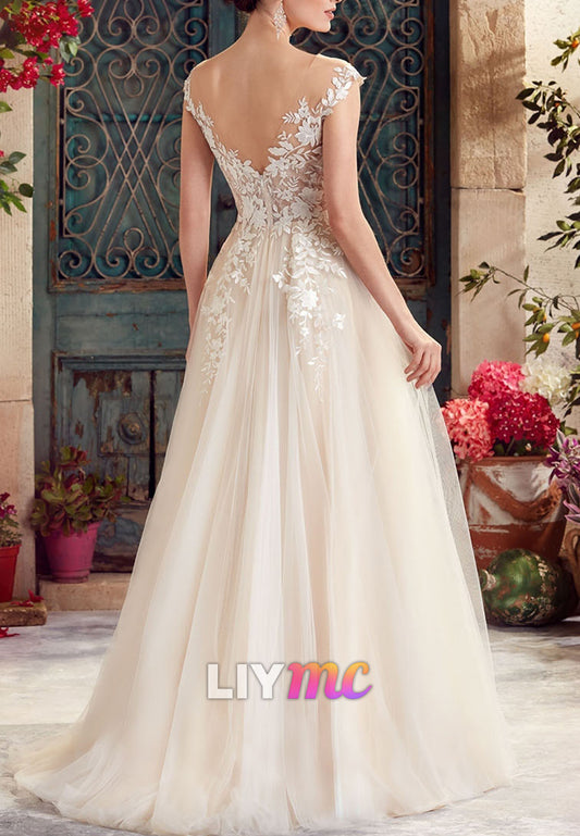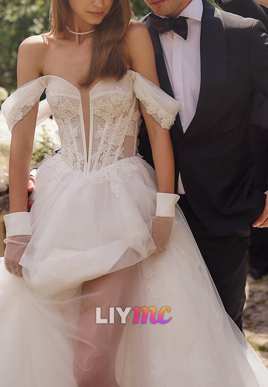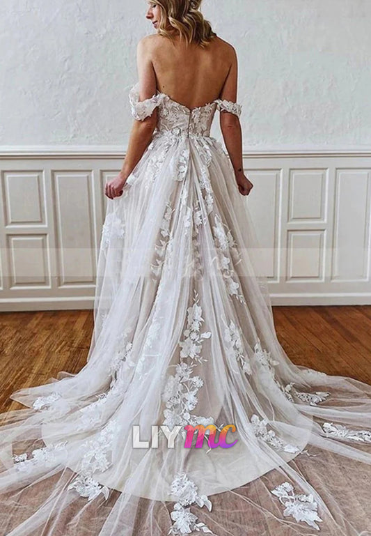 Off-Shoulder Sleeveless Appliques Tulle A-Line Wedding Dress