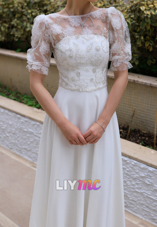 Scoop Short Sleeves Floral Appliques A-Line Wedding Dress