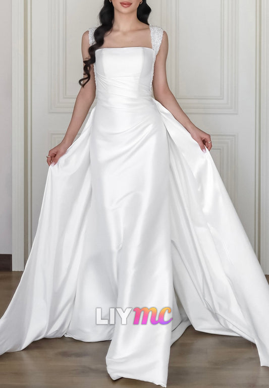 Square Straps Sleek Pleated Detachable Train Sheath Wedding Dress