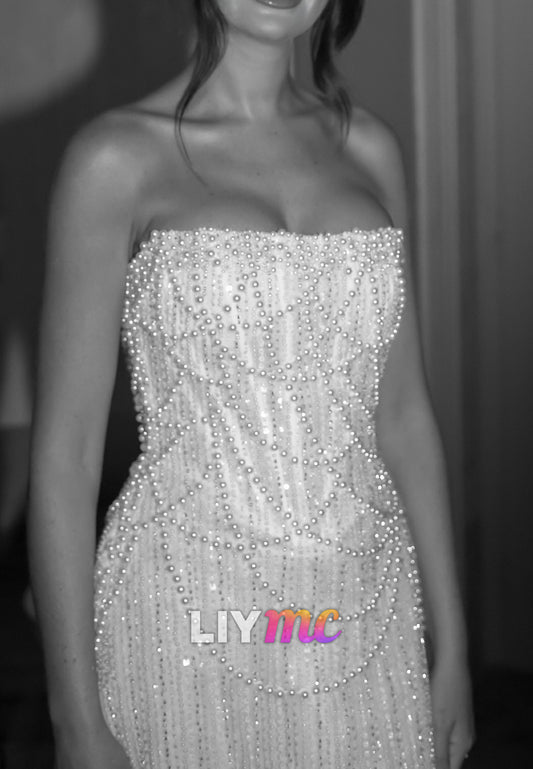 Straight Across Sleeveless Beaded Embellished Pearl Sheath Wedding Dress