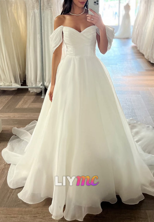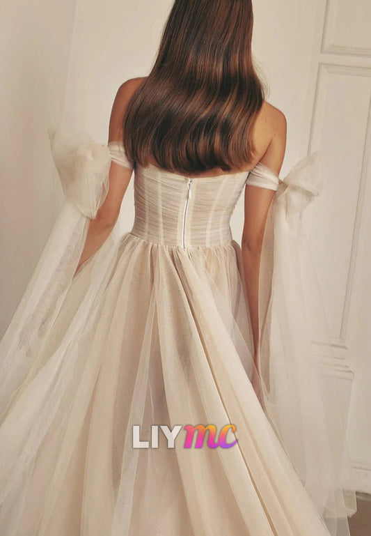 Off-Shoulder Sleeveless Pleated Tulle A-Line Weding Dress