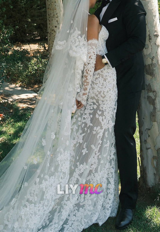 Sweetheart Long Sleeves Lace Appliques Fitted Mermaid Wedding Dress