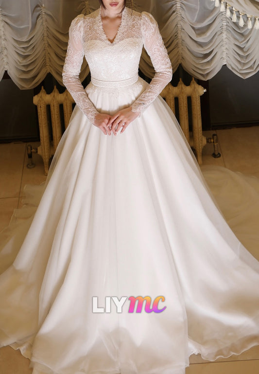 V-Neck Long Sleeves Lace Appliques A-Line Wedding Dress