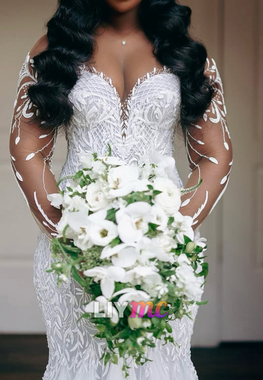 V-Neck Long Sleeves Appliques Mermaid Wedding Dress